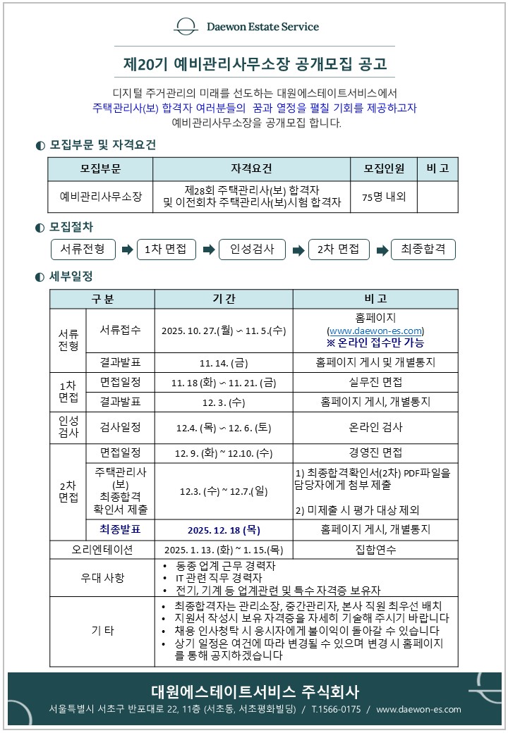 AJ대원 에스테이트서비스 주택관리사(보) 예비합격자 대상 공개채용 안내